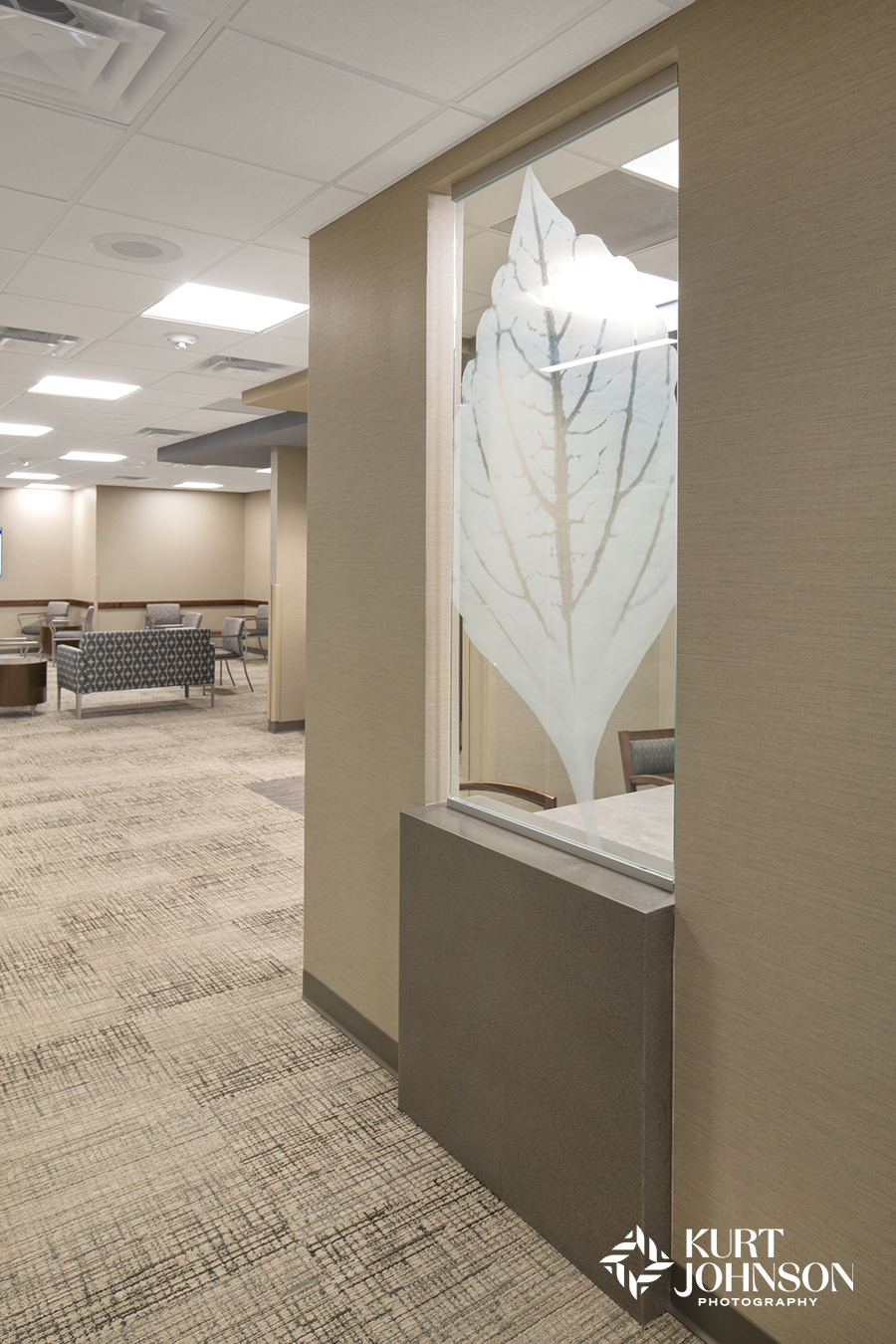 The image above is the reflection room at Omaha’s Community Alliance. Renze took KJP’s Impressionism images and printed them in layers, mounted them with custom-built frames, and backlit the layers before installing the panels directly into the fabric walls that gently curve around a row of seating in the center of the room.