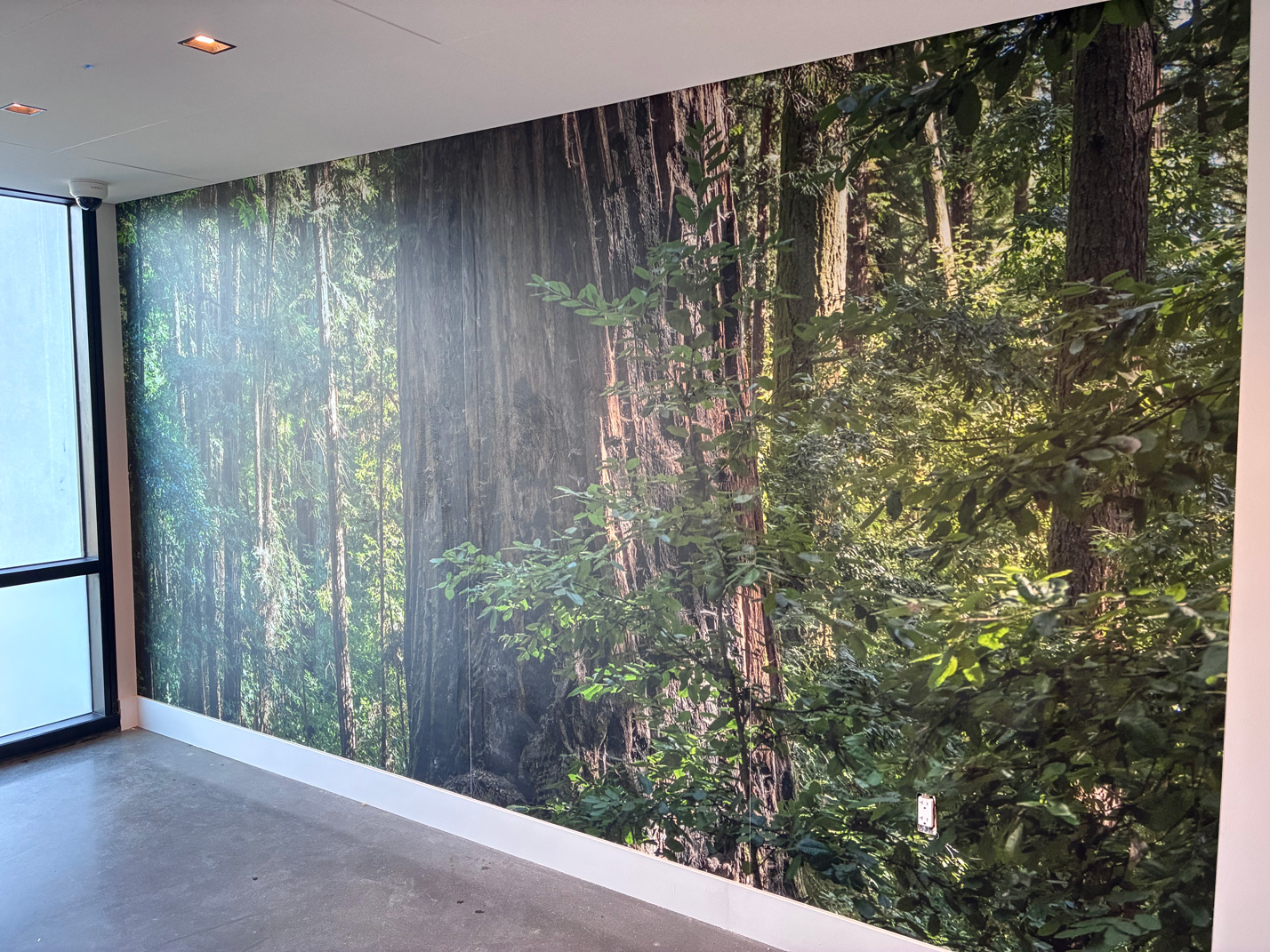 Each wallcovering panel itself measured approximately 206″ wide x 96″ high, and together they form one continuous 55-foot-tall redwood tree, making it feel like you’re stepping into a forest.