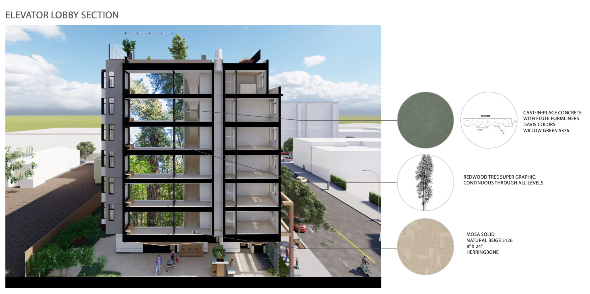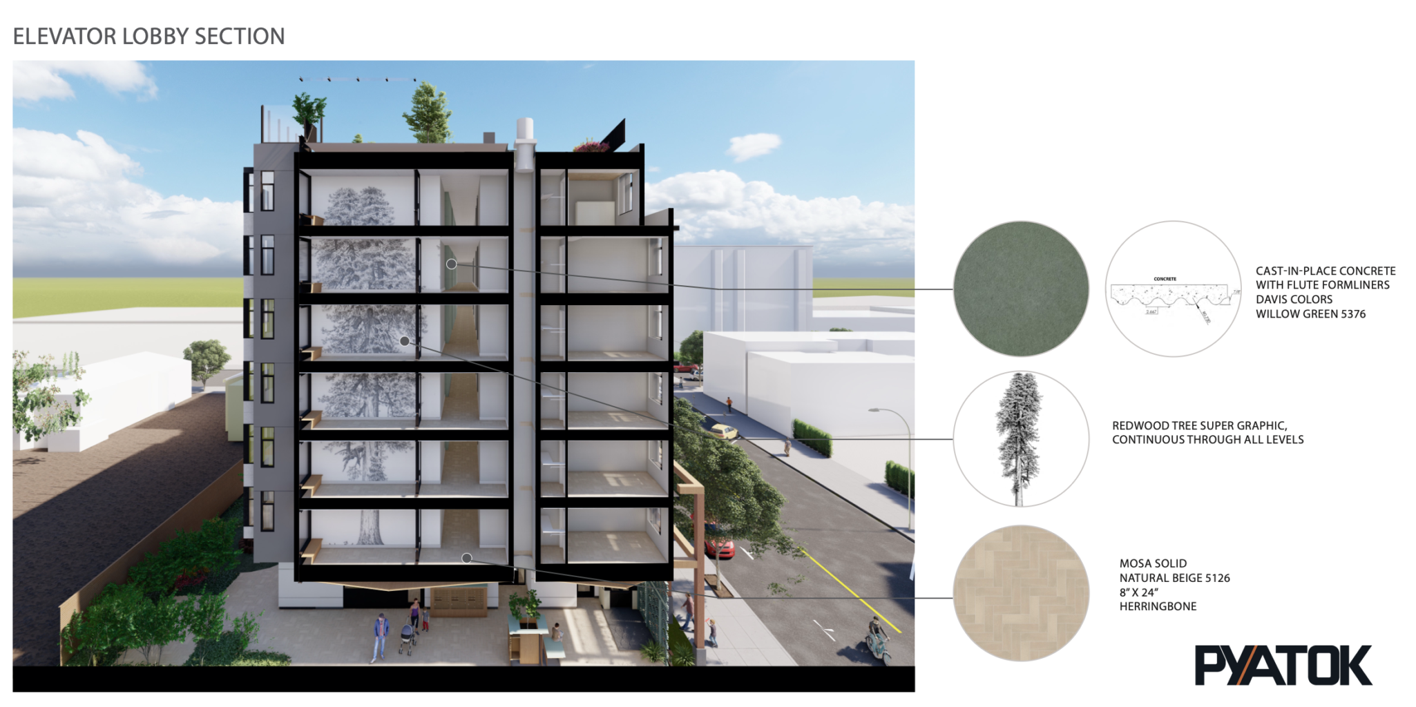 To help visualize the concept, we overlaid the real redwood photograph onto the architectural rendering created by Pyatok Architecture and Urban Design (which was used during the design phase). The image below is a conceptual visualization showing how the final redwood image appears when the six sections are installed.