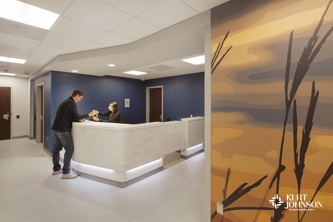 In the installation at The University of Nebraska Medical Center’s Psychiatric Emergency Services Facility in Omaha, Nebraska, large-scale wall graphics of prairie grasses against a soothing sunset transform corridors and waiting areas into welcoming, biophilic environments.