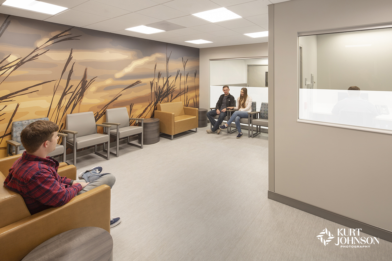 A wallcovering printed by Koroseal brightens a patient room at an Allina behaviroal health clinic in MN.