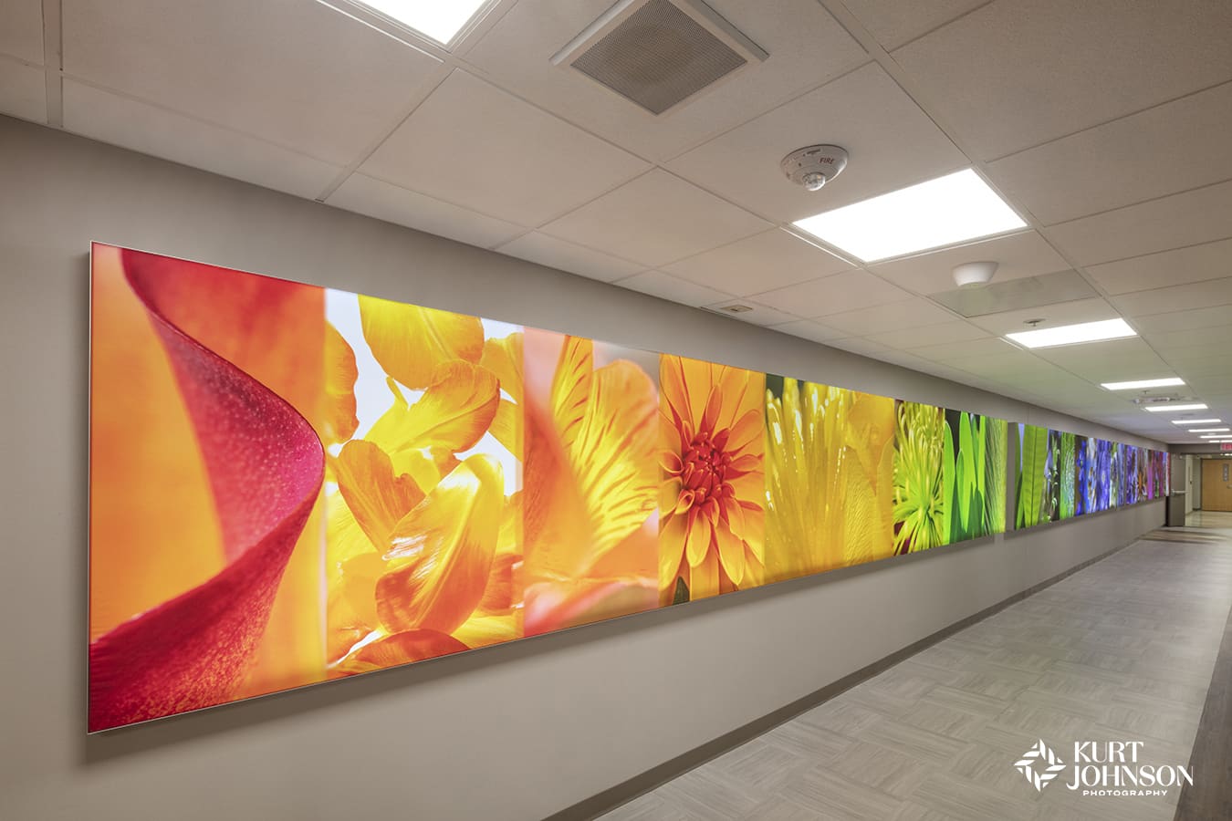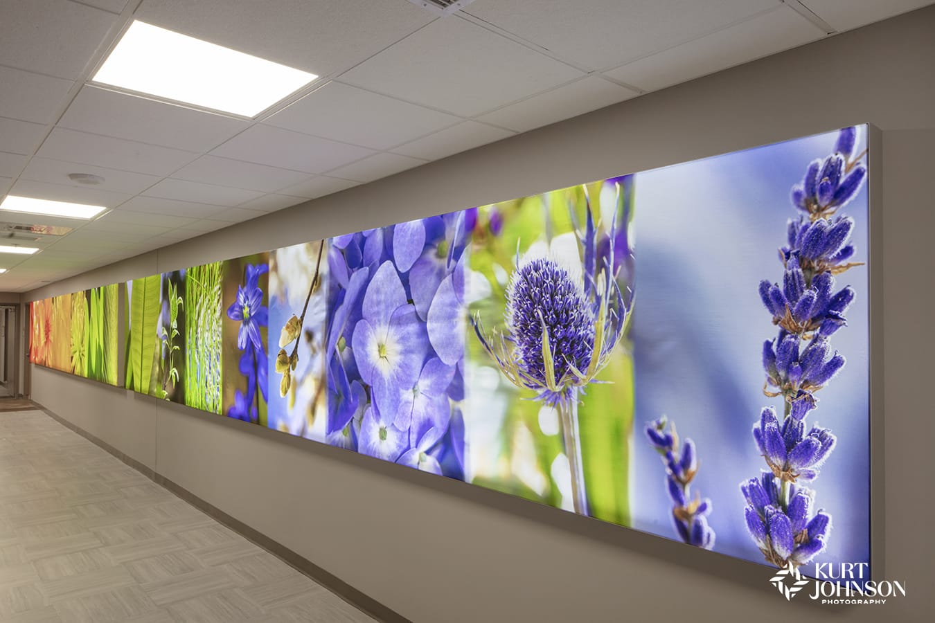 Providence Medical Center in Wayne, NE chose a variety of vibrant flower and landscape photographs printed on acrylic panels to serve as positive distractions for patients as they make their way down long corridors in the hospital. The images have also been uplifting for nurses and staff.