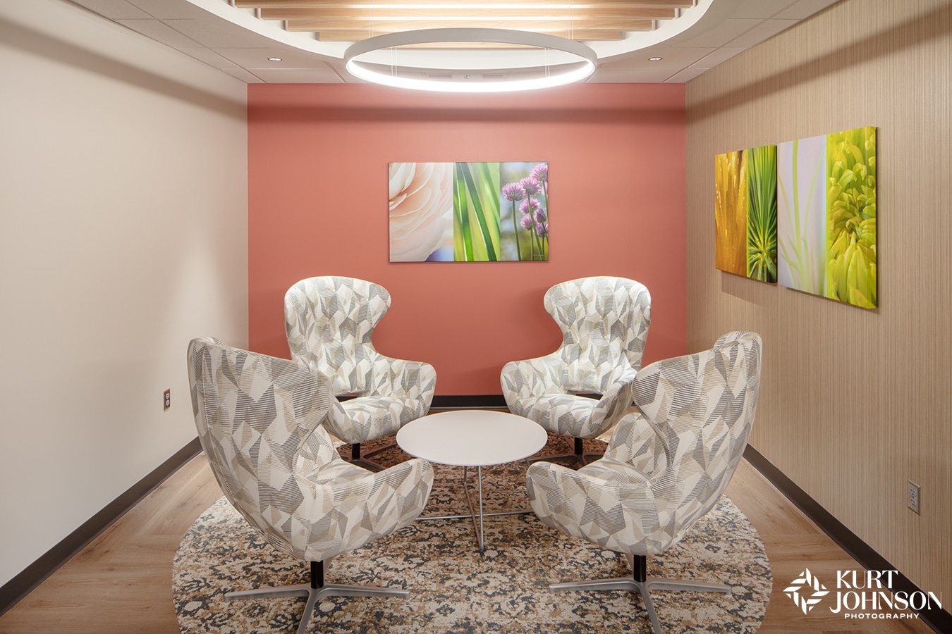 Designer Ashley Hurner hit this one out-of-the-park by envisioning a vibrant, custom color slice down this entire hallway of patient rooms using Kurt’s nature photographs, creating an unmistakable display of biophilic design.