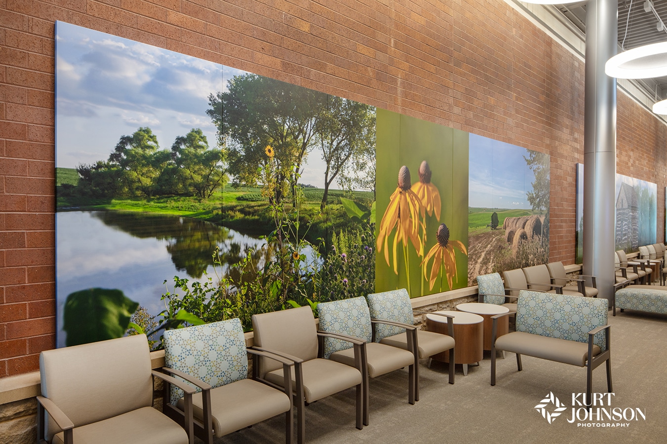 The original windows needed to be covered for the expansion, which made the artwork that was chosen to cover them even more important. The art itself became the new window to the outdoors, with healing views of local landscapes for patients, visitors, and staff.