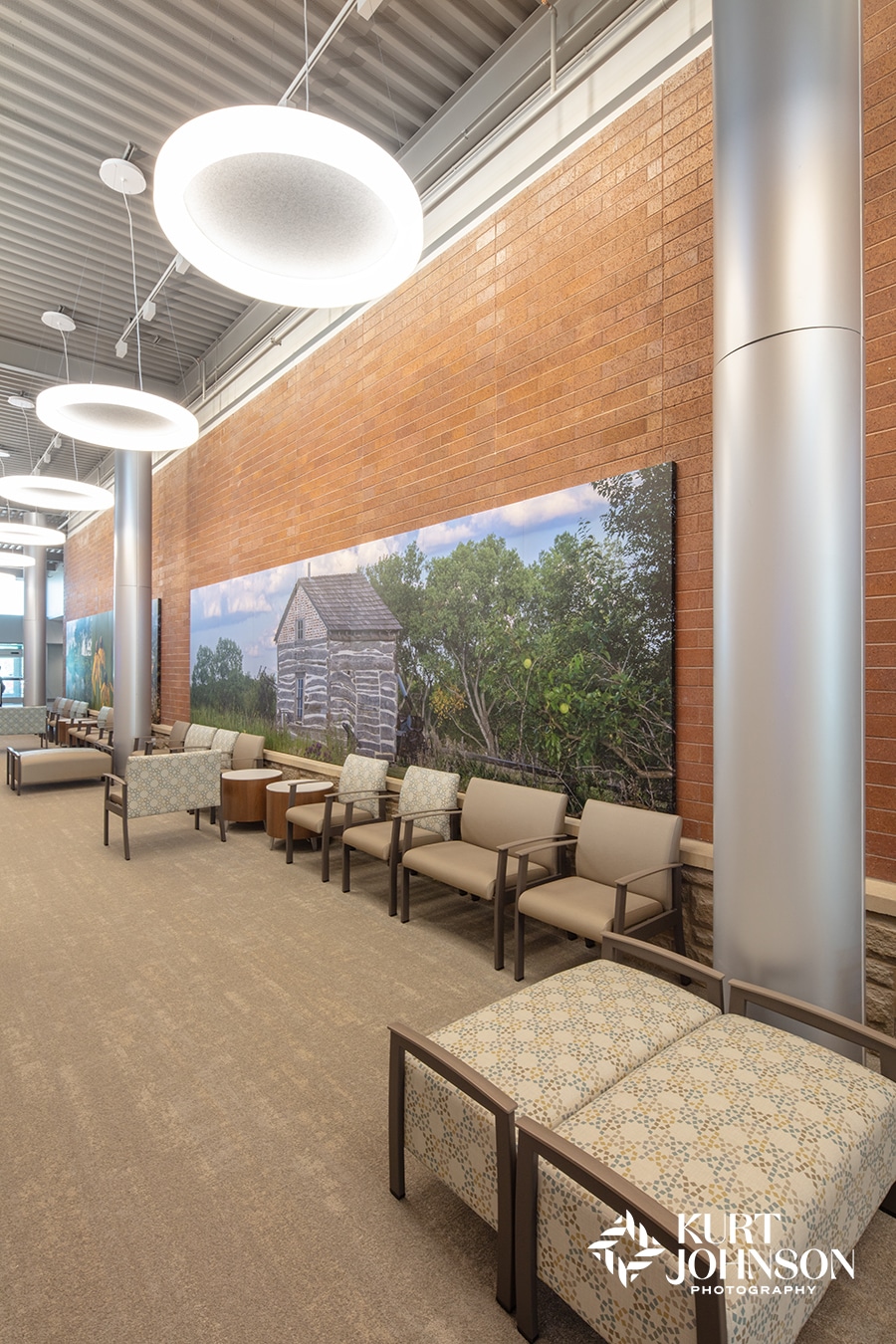 But the expansion project wasn’t just about adding more space; it was about reimagining the healthcare experience. Altus Architectural Studios and Altus designer, Eva Krueger, carefully incorporated modern elements into the new space while preserving the facility’s cherished history. And incorporating local nature photographs to promote healing was an important part of the new design.