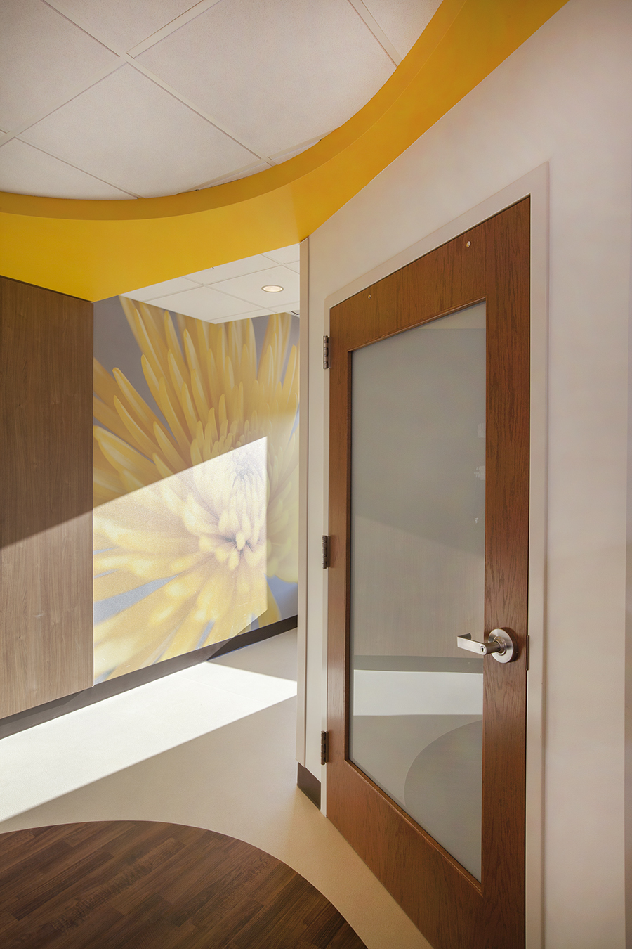 McLellan emphasized: “Nature is a healer,” which led the team to choose large-scale floral imagery as the centerpiece for the space. The concept was for patients and families to feel “physically embraced” by the flowers.