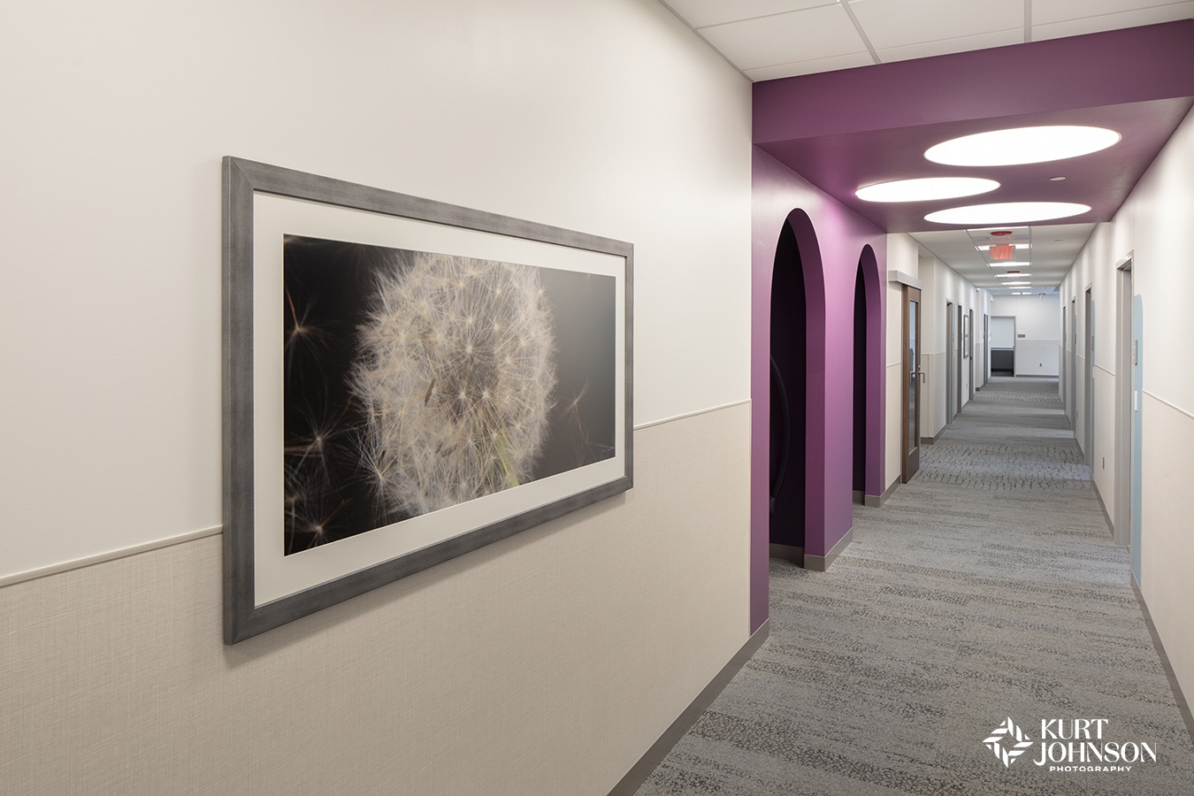 Colorful framed images create a soothing atmosphere for the entire care team at UNMC’s Munroe-Meyer Institute in Omaha, NE.