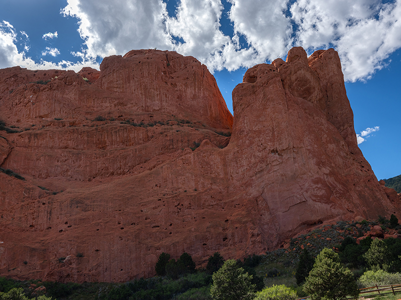 A small olive butte stands at the edge of a green field with a straight row of hay bales on a fall day.