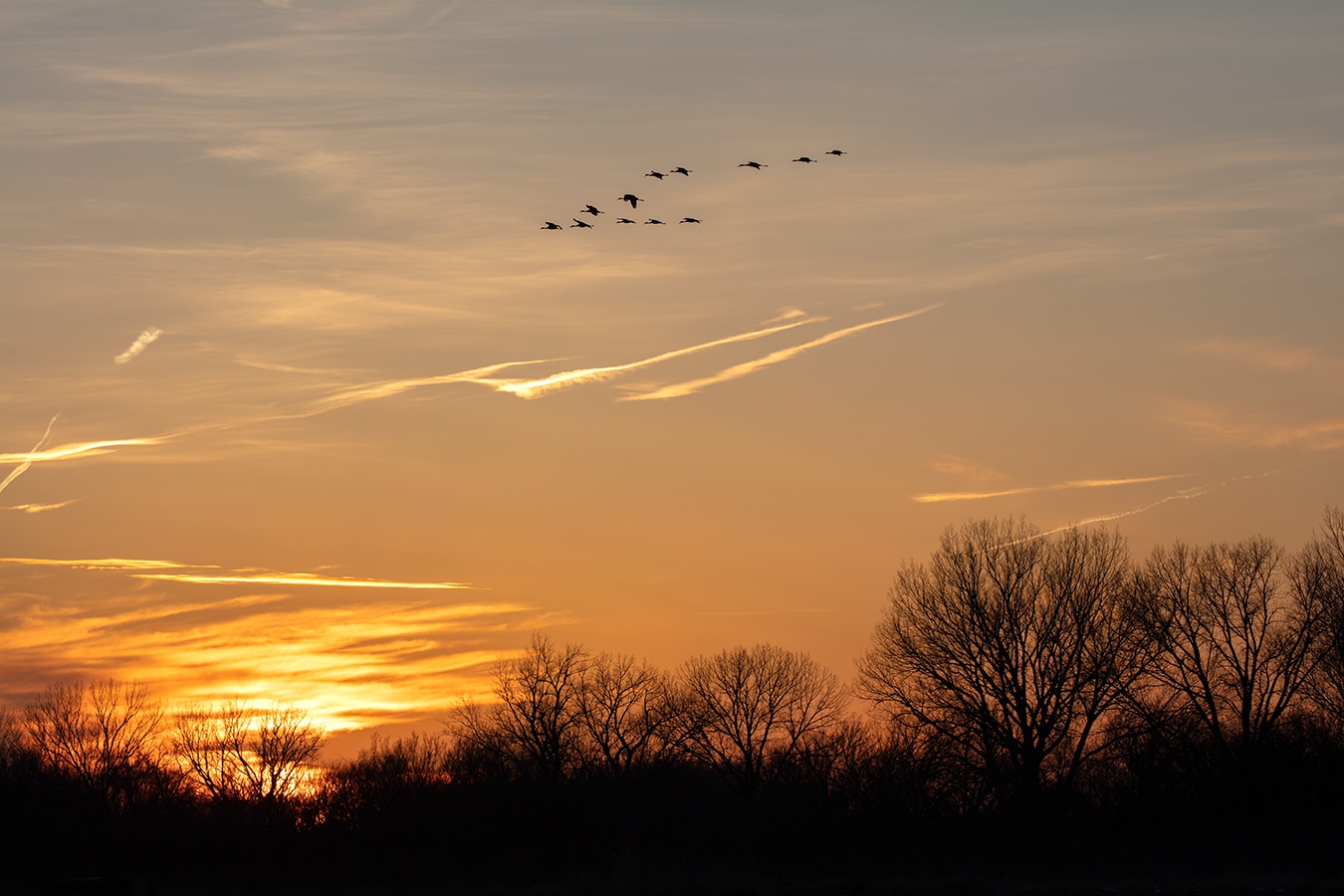 Brown vines engulf the corner of a gray building while new leaves fill the branches of the trees and bushes below it.