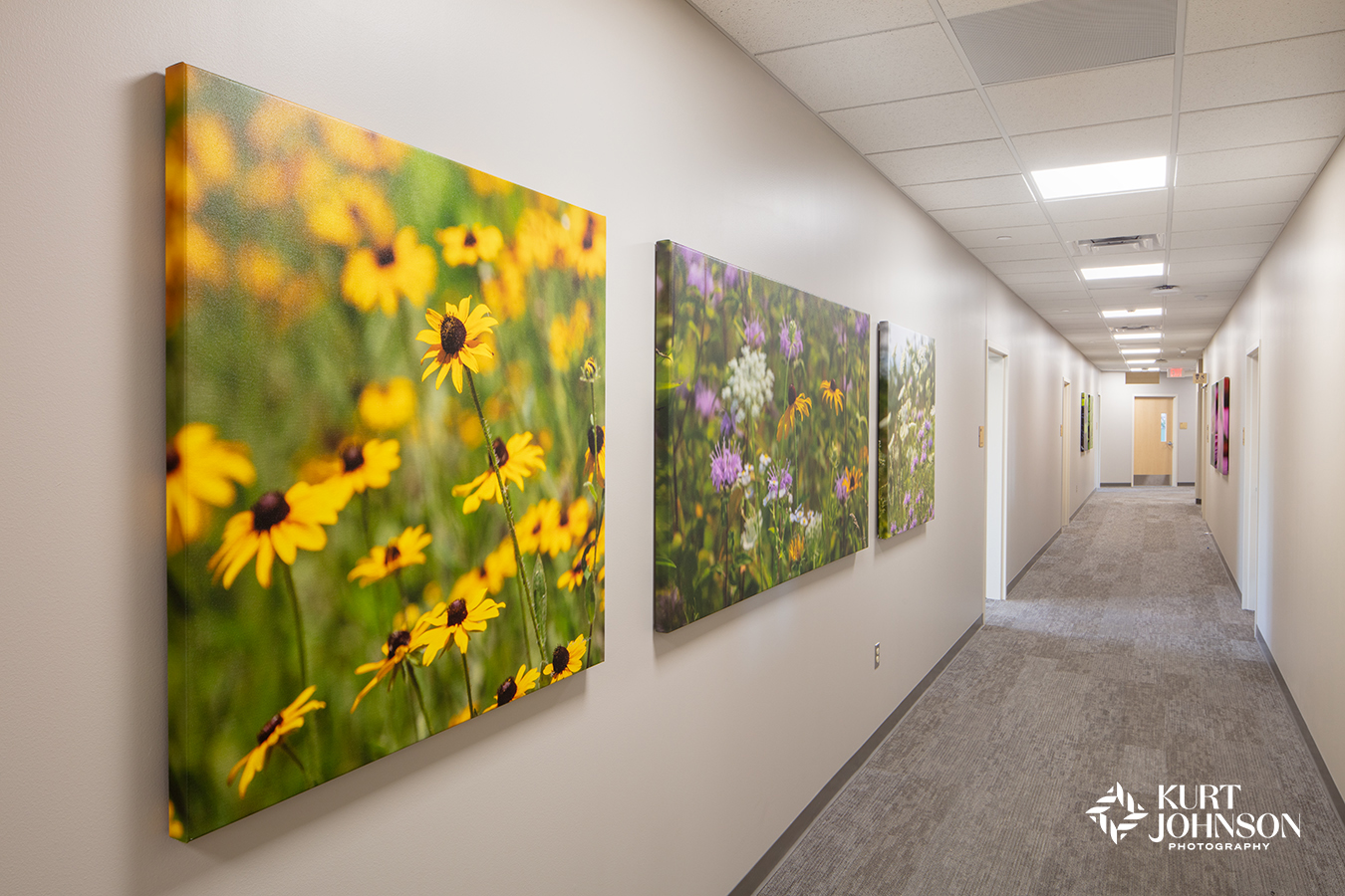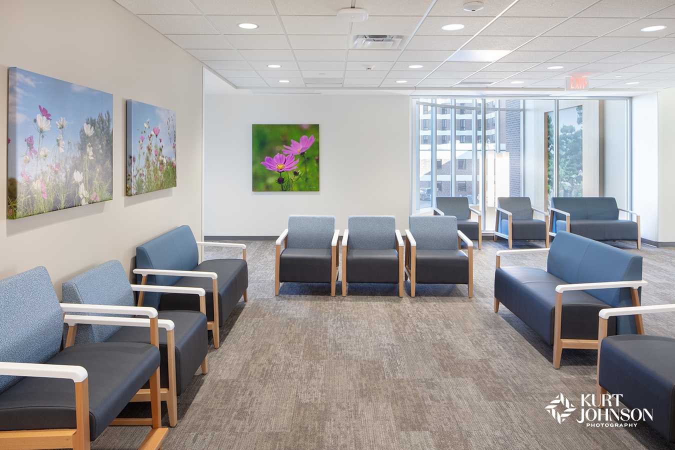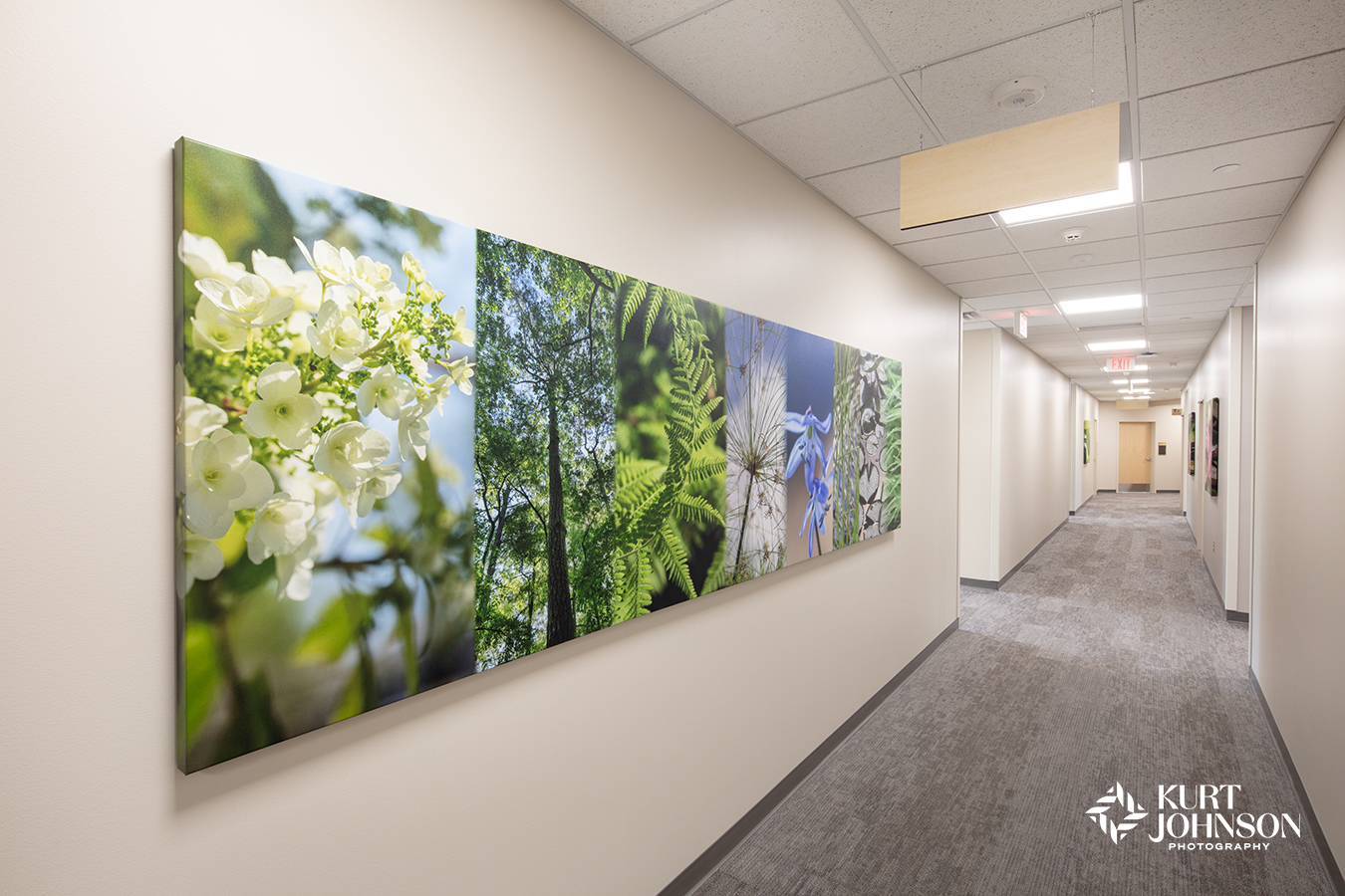 It’s important for hallways and common areas to feature a mix of soothing and inspirational images to uplift patients as they move through the facility.
