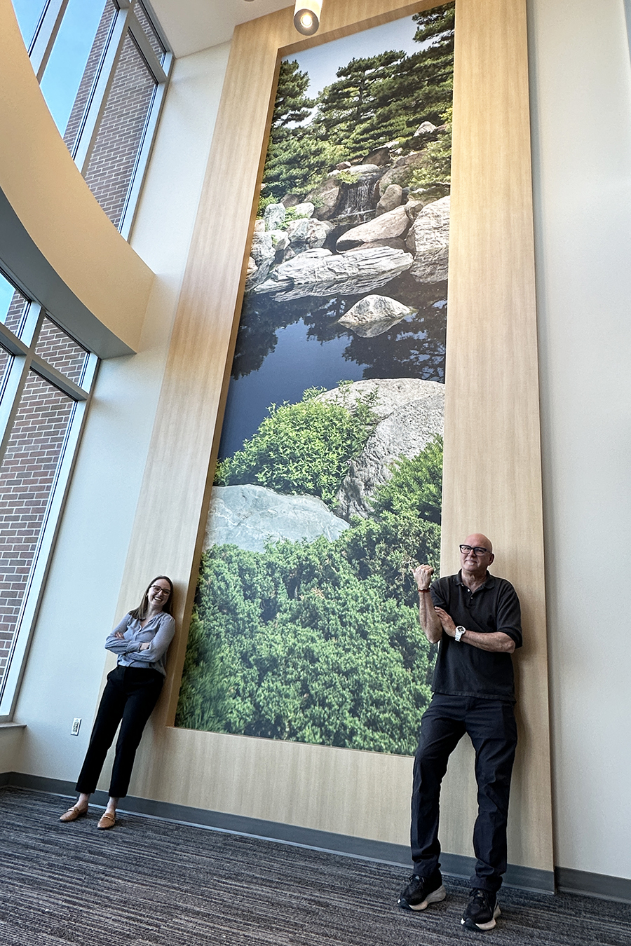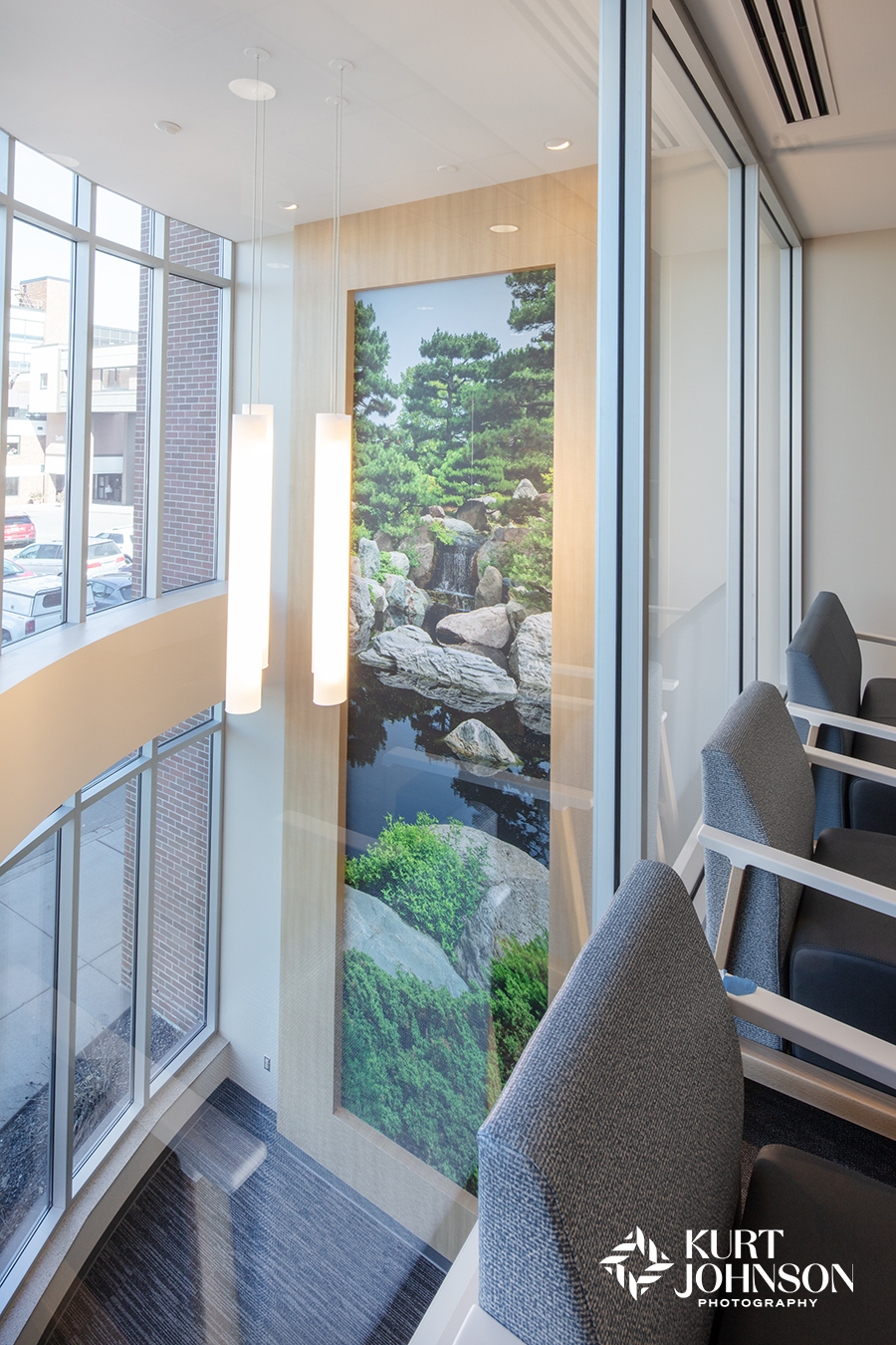 First impressions are important. When you walk through the entrance of Allina Health’s new Center for Mental Health and Addiction, you immediately feel the serenity of the local landscape. A two-story waterfall image taken in the surrounding area covers a 25-foot wall in the atrium, immersing patients, visitors, and staff in the beauty of Minnesota.