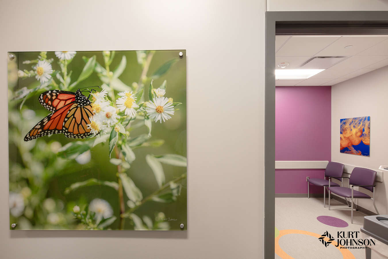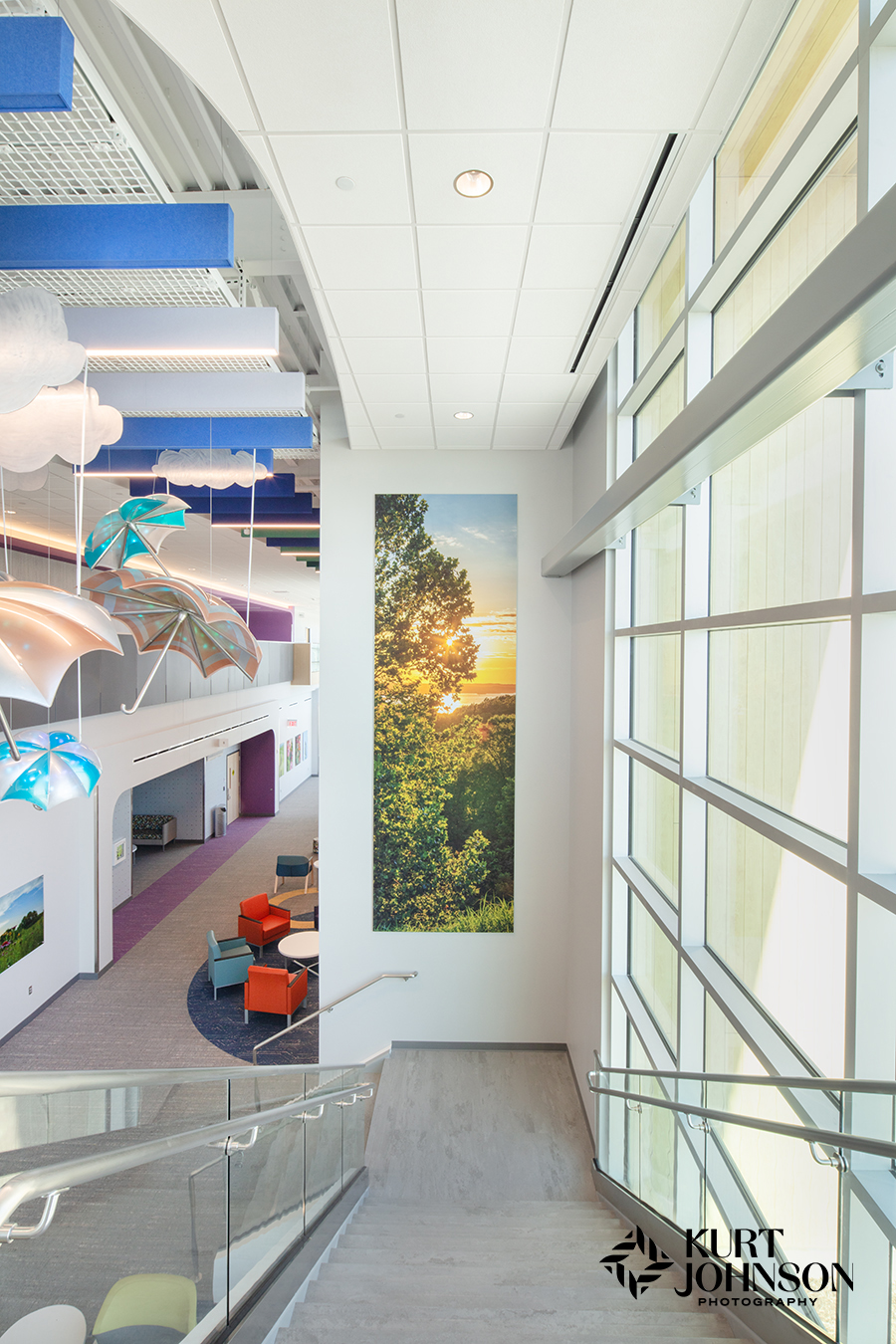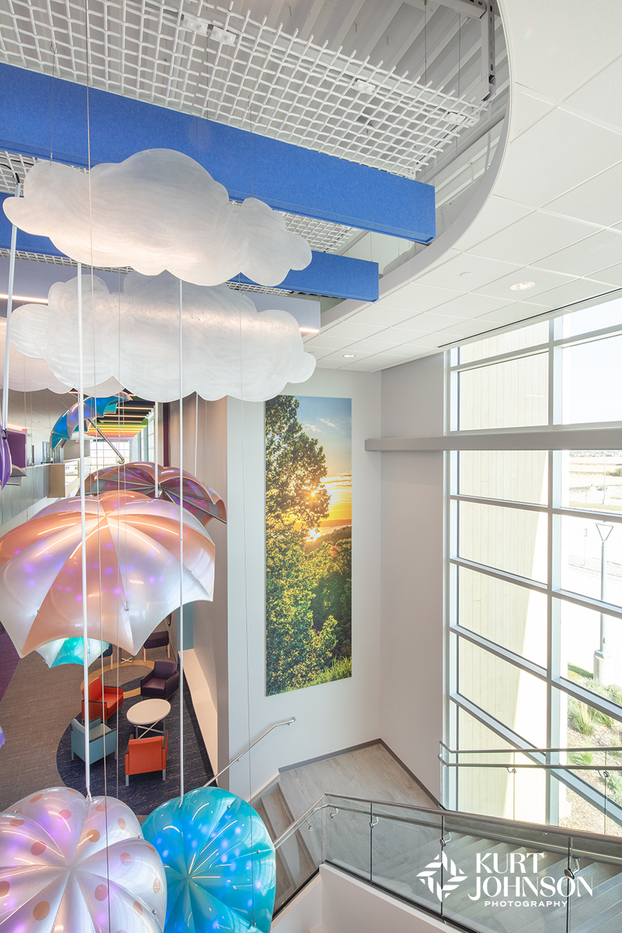 Like most ground-breaking projects, pediatric hospital design requires all hands on deck. And Children’s Nebraska – West Omaha was a collaborative effort by some of the area’s most cutting-edge providers. JE Dunn Construction built the impressive facility and Altus Architects Studios handled the vivid design including wallcoverings, carpet, and the incorporation of Omaha Children’s Medical Center’s iconic umbrella sculptures. Soraya Consult Group rounded out the design with playful furniture and the inclusion of KJP’s healing nature photography. And we had a fantastic time working with Jeff Sorensen of CBRE Project Management and Christi Colbert, BSN, RN, CPN, CNML, AMB-BC, Manager of Children’s Specialty Pediatric Outreach Clinics.