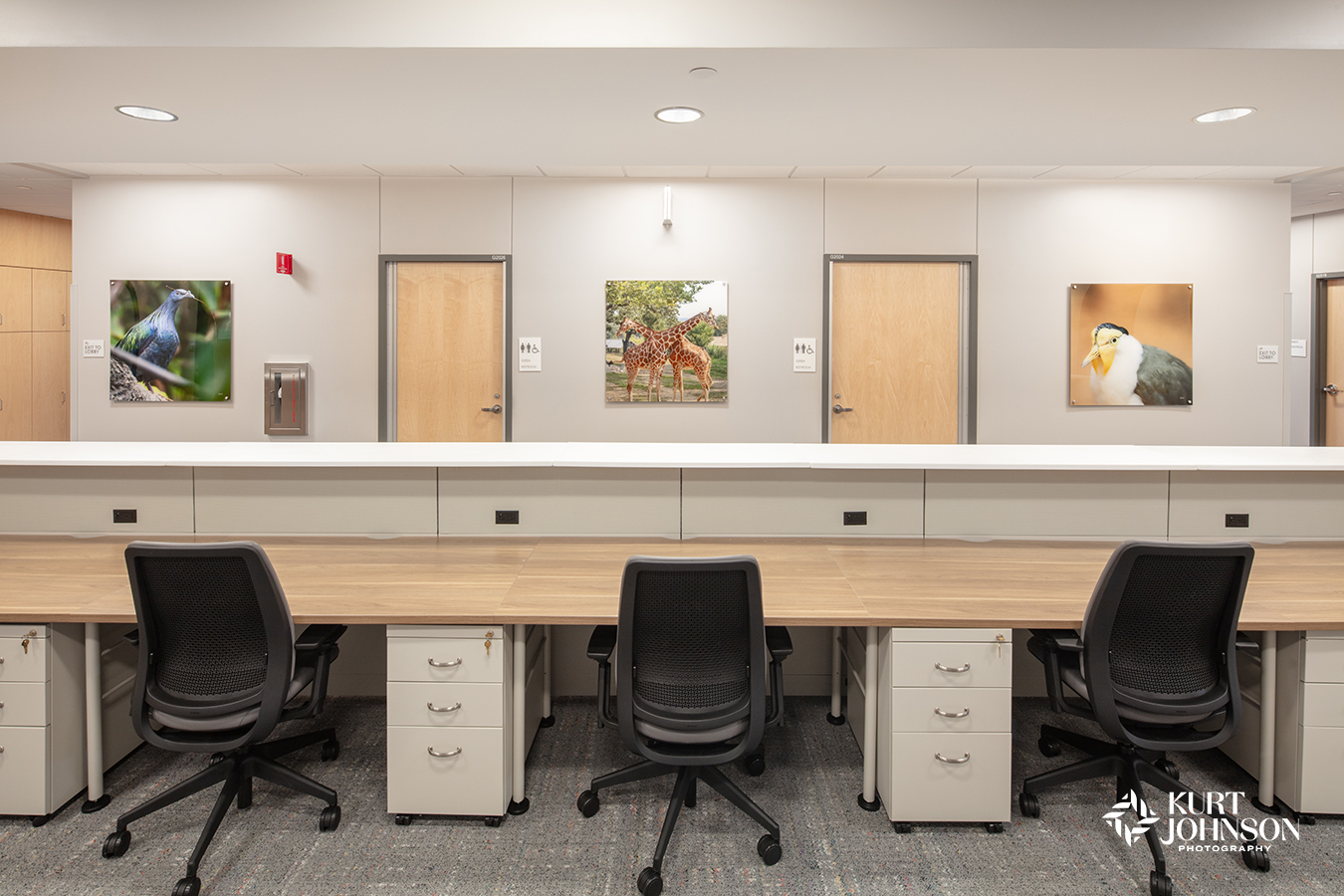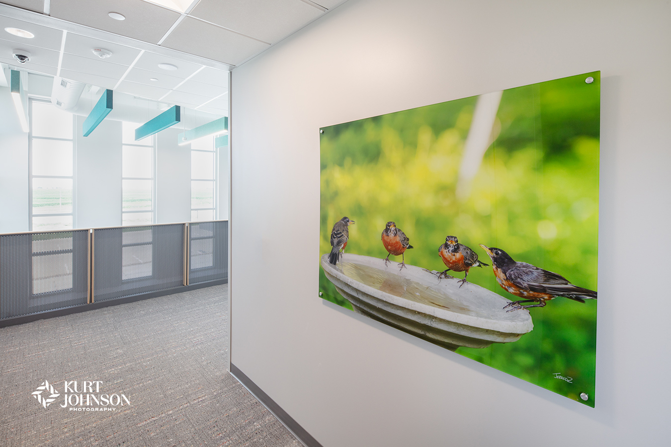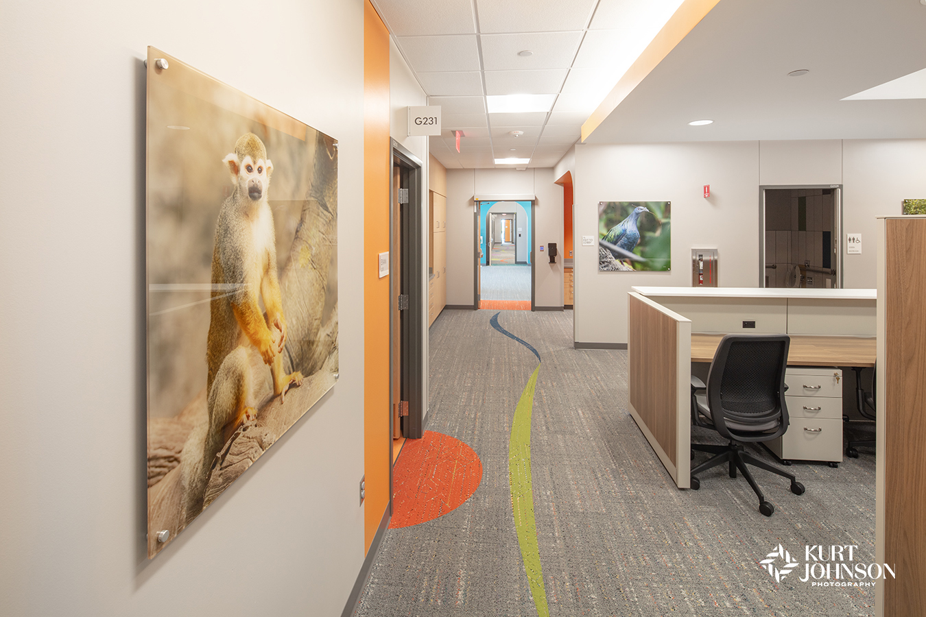 Bold colors fill the rooms and hallways, from the gentle blues and greens of skies and camouflaged frogs to golden rays of sunshine beaming down on a group of sun-bathing turtles. Playful shots of animals adorn the walls of waiting and exam rooms and also add a fun vibe to staff areas. Several of the images were taken locally at the nation’s award-winning Omaha’s Henry Doorly Zoo.