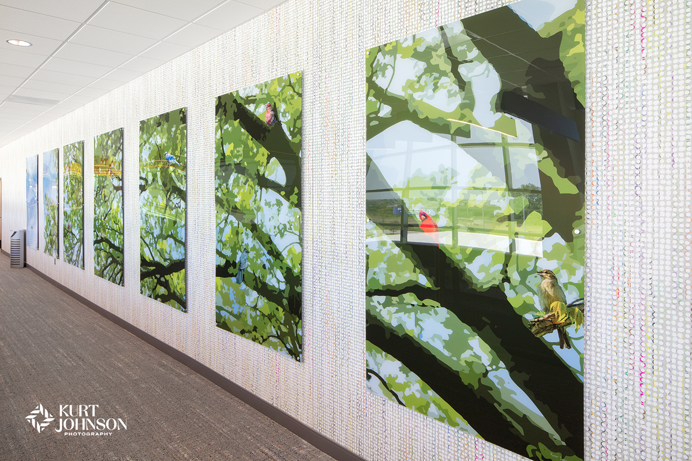 A large-scale custom vector mural was hung on 7 panels stretching across a 60 foot hallway on the 2nd floor of the facility. KJP artistic director, Tori Gerkin, worked with the design team to create the playful scene to Children Nebraska’s specifications. The image was vectorized to add a whimsical touch to this engaging, nature-based graphic kids can’t stop talking about!