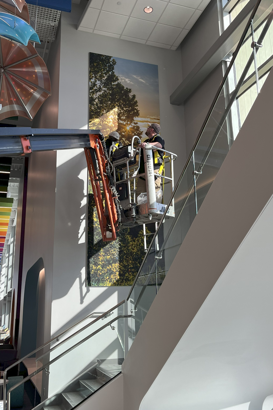 A show-stopping 2-story vertical vector image of a soothing sunset greets patients, families and staff as they walk through the main entrance or take the stairs. This approximately 5 ft wide by 16 ft tall landscape image installed via a Renze REXframe is a beacon in the space. Hanging an image this size was no small feat, and the final result makes a big splash on what would otherwise be an oversized blank wall.